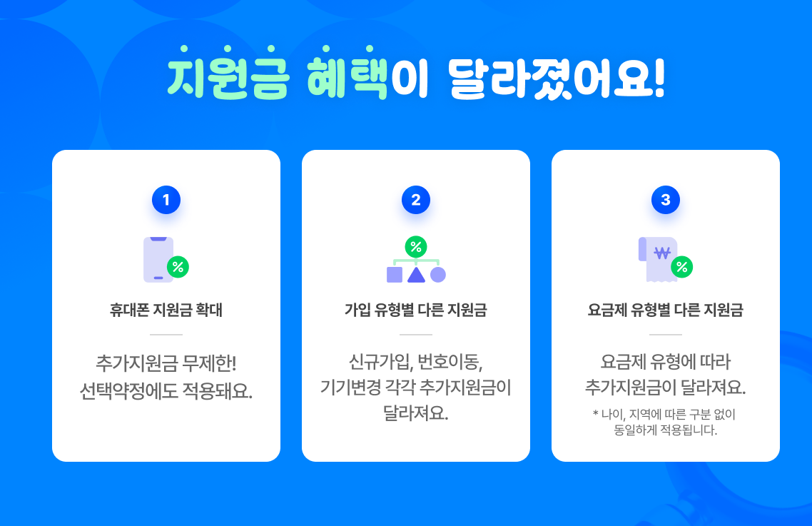 | 요금할인 + 지원금 | 둘 중 하나만 선택 가능 | 요금할인과 추가지원금 동시 가능 |