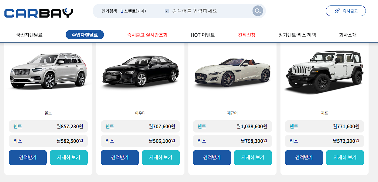 카베이도 인지도 있는 자동차 리스 사이트 입니다. 2013년부터 지금까지 안정적으로 운영되었으며 누전 14,000대의 거래가 있는 곳입니다. 국산차와 수입차 모두 리스 가격표를 확인하실 수 있고, 이벤트 특가 혜택전으로 좋은 혜택을 받을 수도 있습니다. 특가차량이 이벤트로 나오기 때문에 자주 방문하여 혜택을 보면 더 좋습니다.