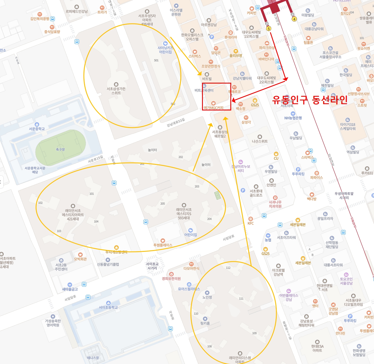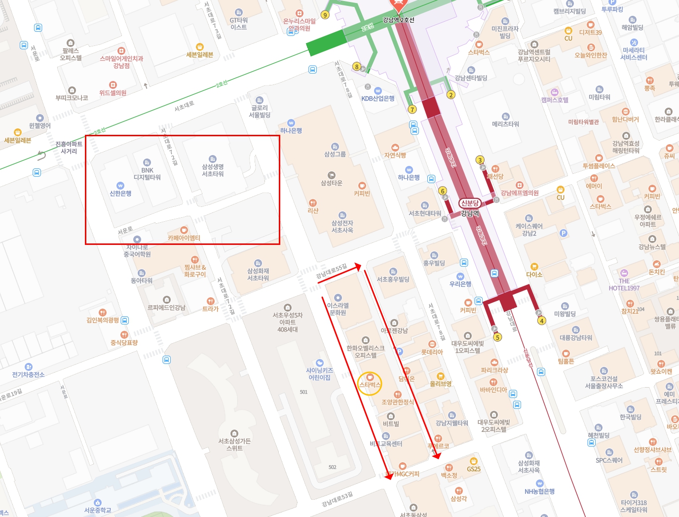 이 일대는 주거세대와 직장인 수요가 동시에 탄탄한 것이 강점입니다. 주변에는 서초삼성가든스위트, 서초우성5차, 래미안서초, 래미안이더스원 같은 대단지 아파트들이 자리하고 있어 주거 배후세대가 충분히 확보되어 있습니다. 이 단지들의 주민들이 실제로 강남역 5번 출구쪽을 자주 이용하는 구조라 자연스러운 소비 동선이 형성됩니다. 또한 바로 옆에는 대기업 사옥들이 밀집해 있어 점심시간과 퇴근시간에 유동인구가 폭발적으로 증가하는 지역입니다. 이 직장인 수요는 이미 해당 라인을 중심으로 먹자골목과 브랜드 상권을 만들어내고 있고, 대부분의 매장이 공실 없이 꽉 차 있을 만큼 장사가 잘 되는 자리로 평가받습니다.