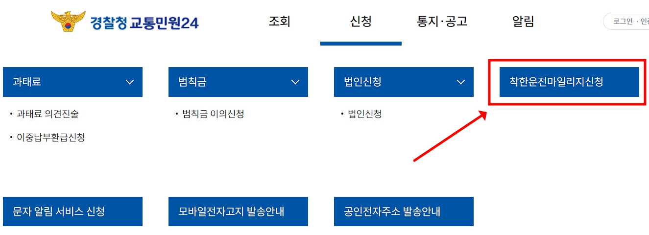 경찰청교통민원24 사이트를 통하여 메뉴에서 착한운전 마일리지 신청을 하시면 간단합니다.