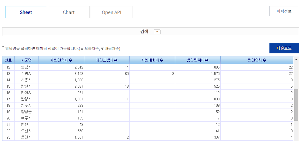 지금까지 지역별로 택시면허가 얼마나 발급되었는지 확인할 수 있습니다.