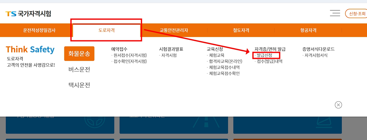 상단메뉴 「도로자격」 클릭 후 자격증/ 면허 발급 아래 발급신청을 클릭해주세요.