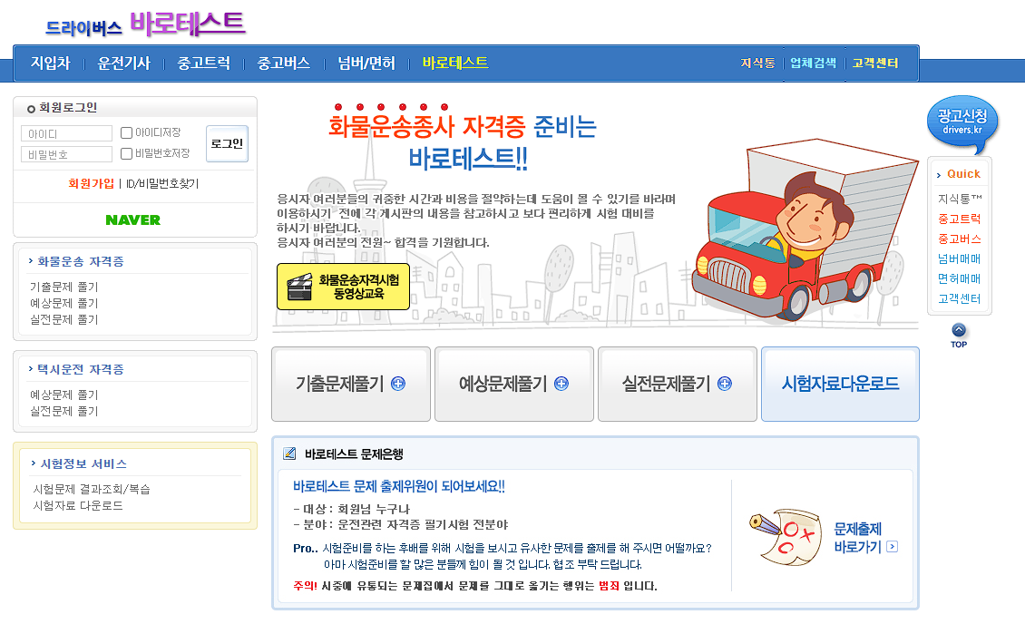 아래 드라이버스 바로테스트 홈페이지에 접속하면 기출문제부터 예상문제, 실전문제풀기까지 아주 유용한 자료가 많이 있습니다. 다시 한번 말씀드리지만 화물운송종사자 시험은 문제은행 형식으로 기출문제가 반복되는 경향이 있기 때문에 기출문제 풀이 반복은 중요합니다.
